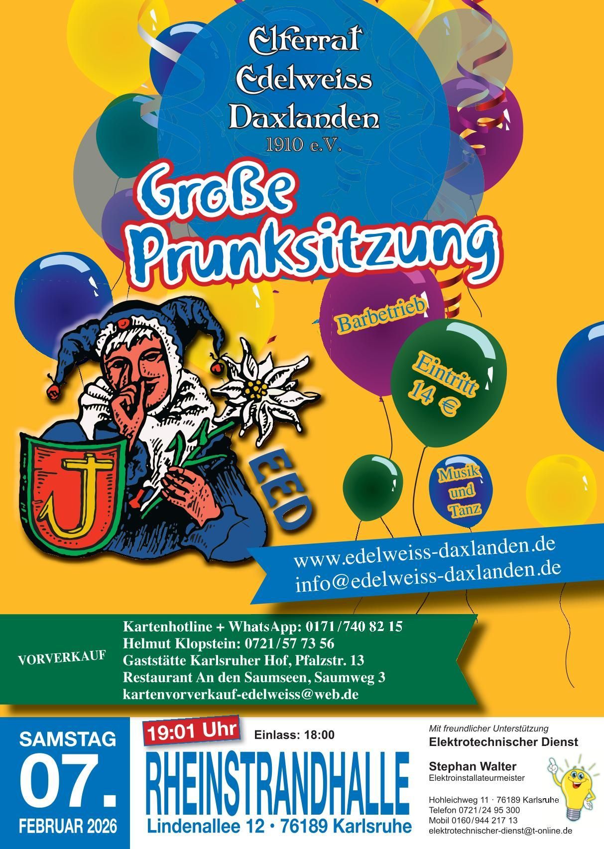 Der Vorverkauf für unsere Große Prunksitzung am 07.02.2026 ist gestartet.